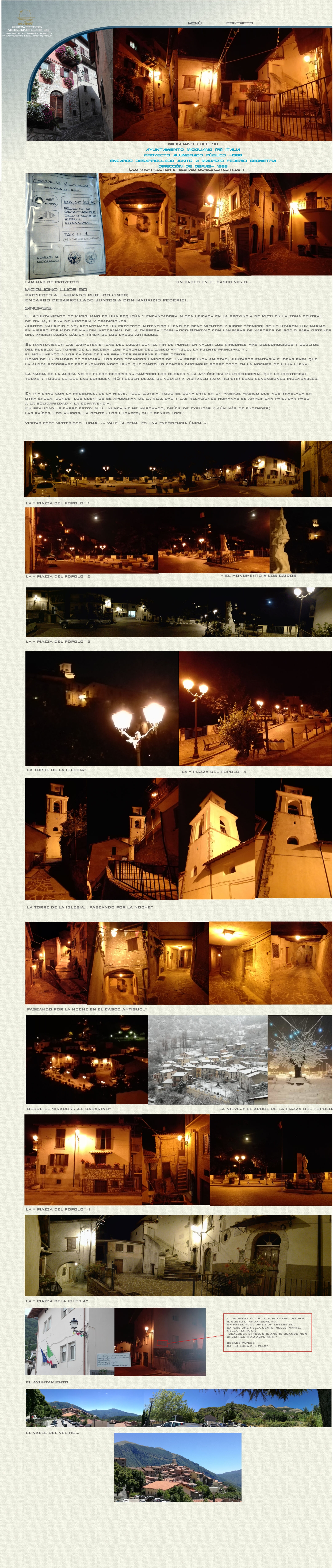 encargo desarrollado junto al compañero y amigo maurizio federici geometra, en el 1988 y a posteriori se desarrolló la dirección de obra en el 1996. las peculiaridades de los contenidos del proyecto fueron y son muy esperadas, teniendo en cuenta muchos rincones del aldea que de noche, se convierte en un autentico cuadro surrealista sobretodo en invierno.se iluminó la torre de la iglesia,tanto directamente que con efecto silueta; se iluminó el monumento a los soldados caídos en dos guerras mundiales; mediante el uso de linternas en acero forjado con lámparas con vapores de sodio se consiguió un efecto cálido típico de los cascos históricos de la comunidad autónoma del lazio.