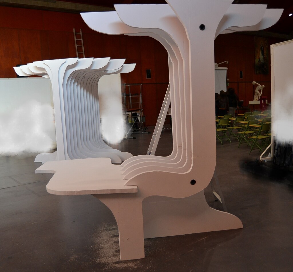 Es una instalación que se propone reavivar el debate de una obra conceptual vinculando Escultura y Arquitectura en un mismo lugar el donde nunca terminan de expresarse ni de moverse…se inspira ¡Al Garoé,.... la anatomía humana que plasma los tejidos y se expresa dentro las prendas de los diseñadores en constante fusión con su entorno natural: