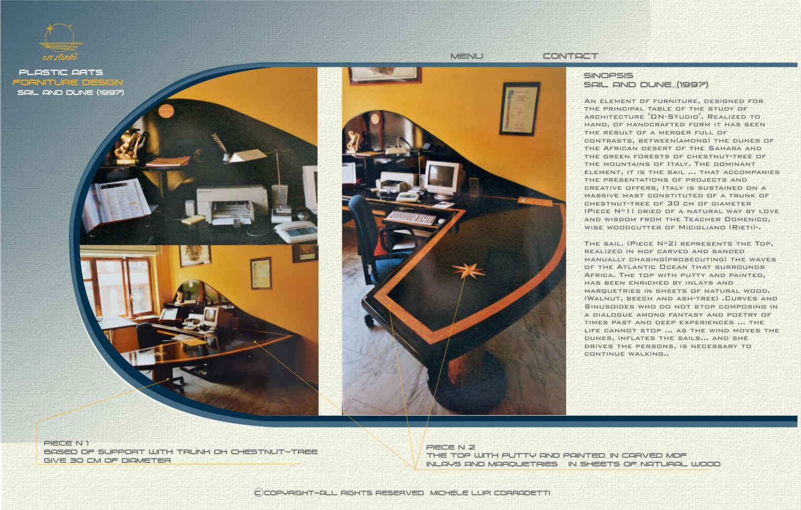 VELAS Y DUNAS es un elemento de mobilario diseñado para la mesa principal del estudio de arquitectura “ ON studio” en 1997, realizado a mano de forma artesanal ha sido el resultado de una fusión llena de contraste entre las dunas del desierto africano del sahara y los verdes bosques de castaño de las montañas de italia. El elemento dominante, es la vela...que acompaña la presentacónes de los proyectos y de propuestas creativas.....se sustenta sobre un mastíl macizo constituido desde un tronco de castaño de 30 cm de diámetro....